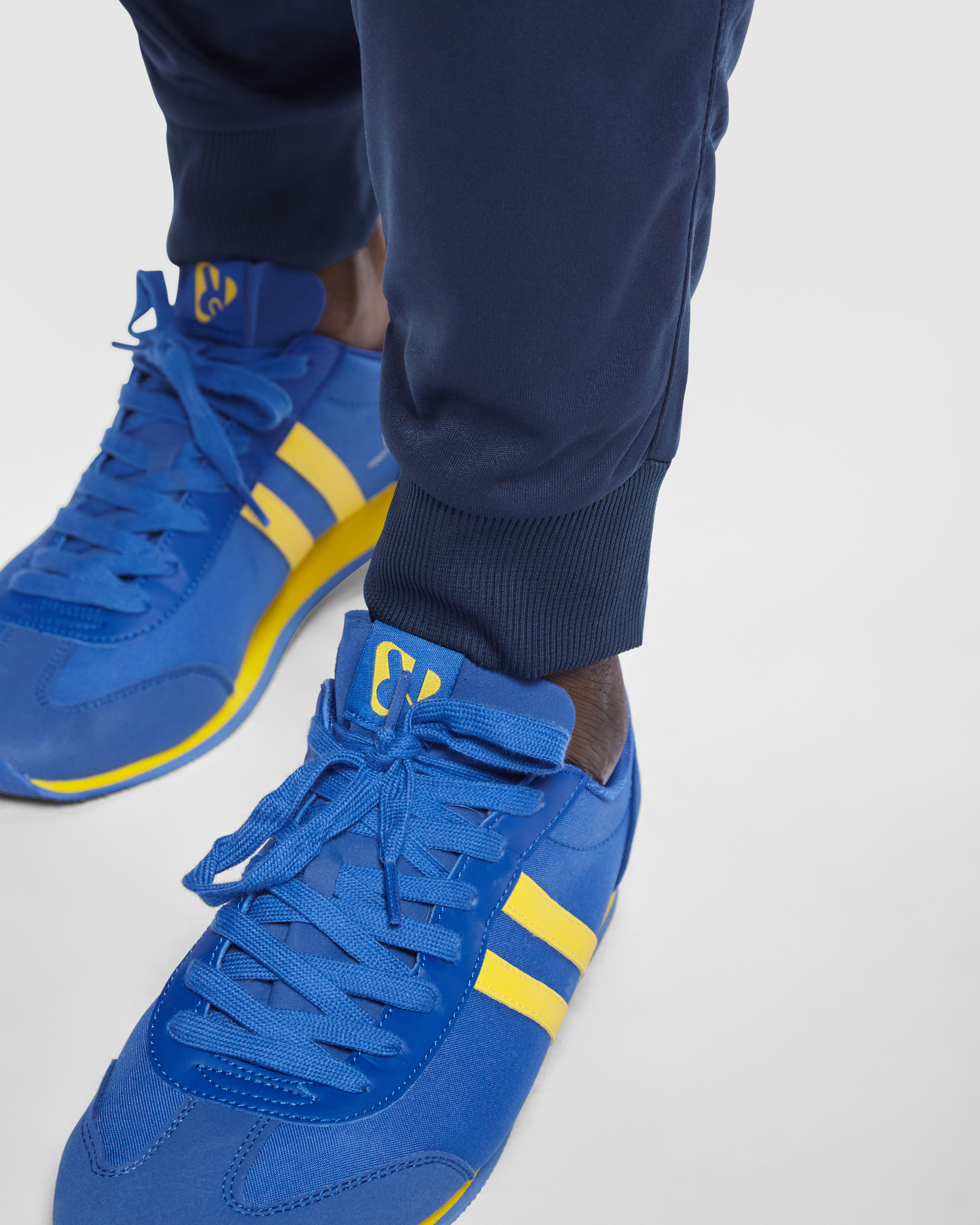 Pantalón largo de entrenamiento corte pitillo. Cinturilla engomada con cordón ajustable interior. Bolsillos laterales con cremallera en tallas de adulto. Puños en rib 1×1 y cremalleras.
