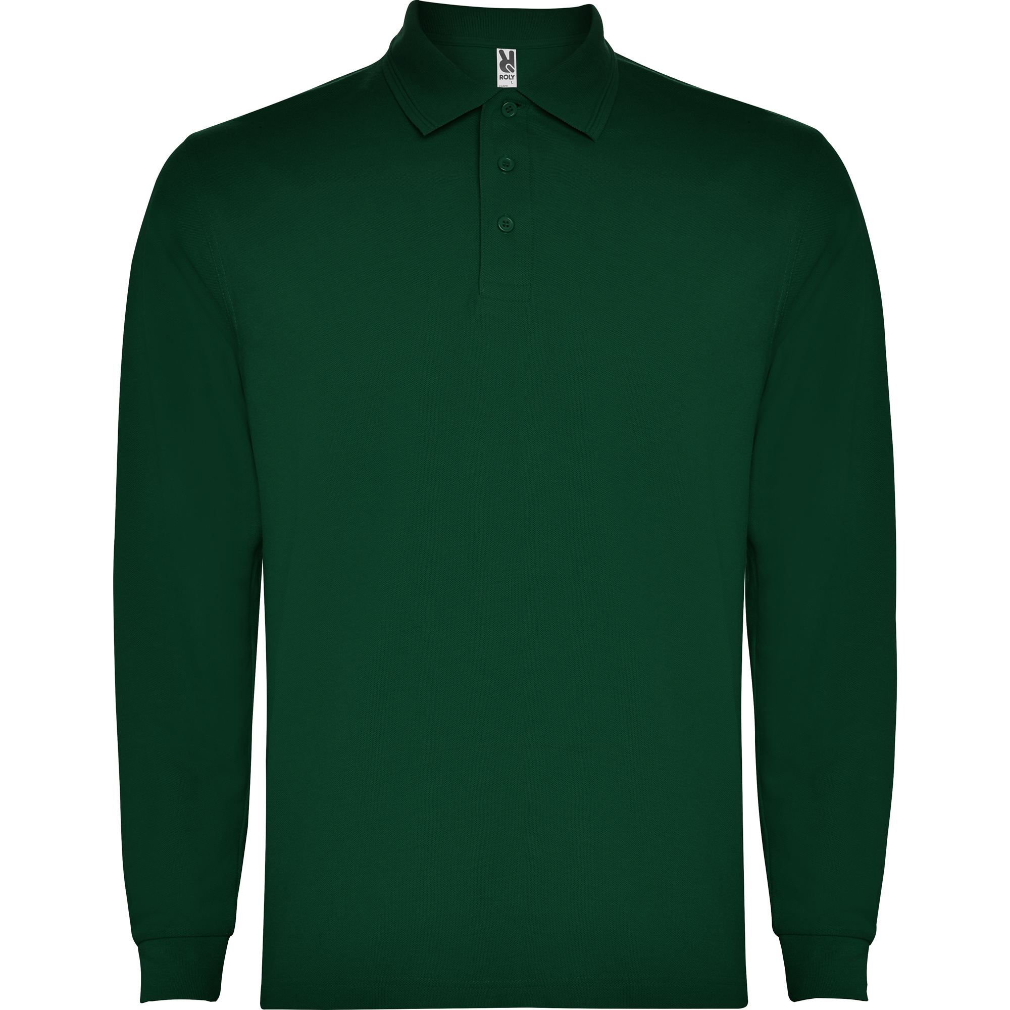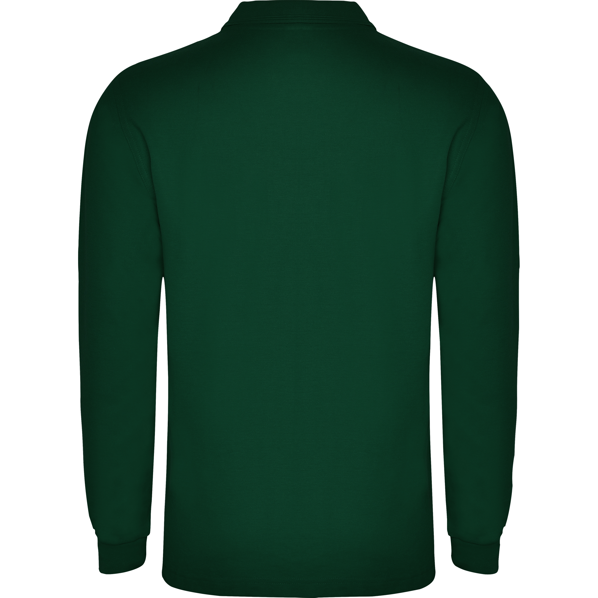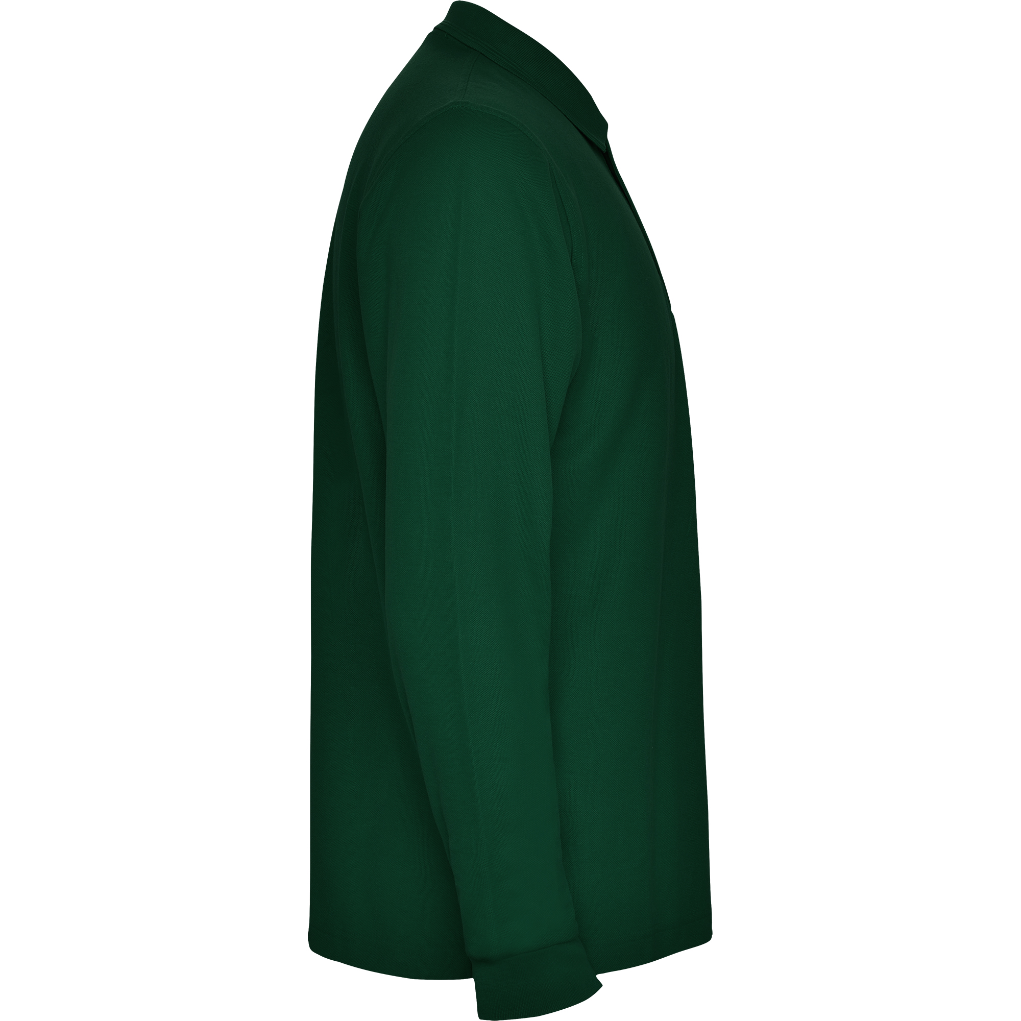 Polo de manga larga. Punto piqué. Cuello y puños tejidos 1×1. Tapeta de 3 botones. Cubrecosturas en cuello del mismo tejido. Aperturas laterales en bajo. Bolsillo opcional.