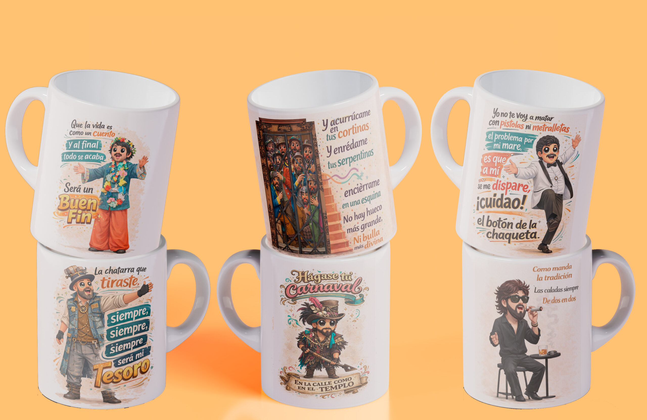 Este pack exclusivo reúne seis tazas de cerámica con diseños artísticos inspirados en la tradición del carnaval y variados: